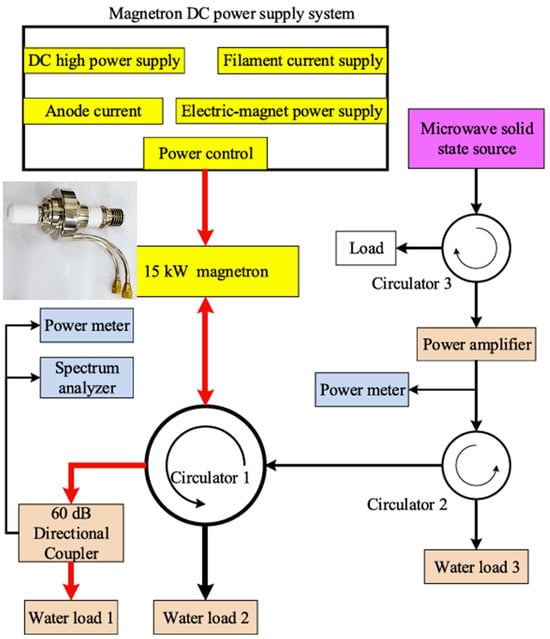 Block diagram of an injection-locked 15 kW magnetron system [65]. Red arrows is the direction of large power output of the magnetron.