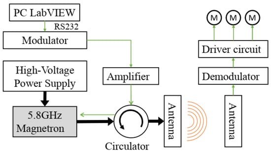 Precise phase control of injection-locked magnetrons provides the fundamental prerequisite for implementing various modulation schemes. Extensive research on magnetron-based modulation has been conducted by Y. Yang et al. at Kyoto University [5,17,25,82,83]. As illustrated in Figure 6 [82], a frequency-shift-keying (FSK) modulator operating near the magnetron’s natural oscillation frequency was employed in [82]. The modulated signal was amplified to 10 W and injected into a Panasonic M5802 magnetron via a circulator. This configuration enables simultaneous wireless power transfer and data communication using amplitude, phase, or frequency modulation. A reliable data rate of 9600 bps with zero bit errors was achieved, demonstrating that an injection-locked magnetron functioning as a power amplifier exhibits excellent controllability [82].