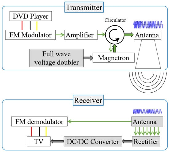 In [83], an injection-locked 2.45 GHz continuous-wave (CW) magnetron was utilized in a wirelessly powered television system (shown in Figure 7). At the transmitter, frequency modulation was applied to the injection-locked magnetron to encode video signals while delivering microwave power. At the receiver, the incident microwave energy was simultaneously rectified to provide 48 W of DC power and demodulated to recover the video signal, achieving a wireless range of 3.5 m [83].