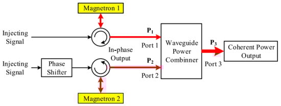 In 2015, they developed and experimentally validated a two-magnetron S-band coherent power-combining system employing 15 kW CW injection-locked magnetrons, achieving combining efficiencies exceeding 95% [67]. As shown in Figure 9, one magnetron’s output phase is actively controlled via a digital phase shifter, while a phase detector continuously monitors the relative phase difference between the two sources [67,68].