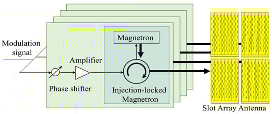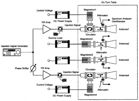 During their wireless power transmission research, Prof. N. Shinohara’s group at Kyoto University successfully demonstrated both power combining and phased-array operation using arrays of commercial magnetrons. Earlier, in the 20th century, coherent power combining of high-power injection-locked pulsed magnetrons was investigated for particle accelerator applications [89,90].