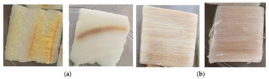Hence, for the same reaction time, less reagent was needed for P. taeda. The time required for total delignification was 300 min for both species; in the case of P. taeda, the wood weakened but did not collapse. In the future, partial delignification [7] for a shorter time (between 180 and 300 min) will be considered. Partially delignified P. taeda retains its distinct growth rings, which many authors describe as “aesthetic transparent wood” [3].