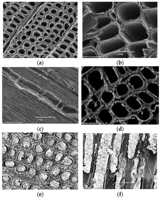 Figure 2 shows the wood appearance after delignification with 3.5% NaClO2 for 300 min for P. taeda (a, b) and E. bosistoana (c, d). Crosswise-cut P. taeda shows enlarged and deformed cell lumens and a thinned cell wall due to the loss of its structural polymers. Delignification did not significantly damage the structure of eucalyptus’ cell wall. After impregnation, the epoxy resin occupies both the empty cellular lumens and the cell wall with a heterogeneous distribution (Figure 2e,f). As with Pinus wood, the epoxy resin distributes heterogeneously both in the lumens and the walls.