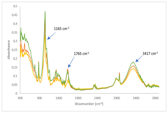 In accordance with the literature [14,17,21], the considered absorption peaks were the following: 3417 cm−1 assigned to the vibrational narrowing of the O-H bond in cellulose, 2920 cm−1 assigned to the vibrational narrowing of the C-H bond, 1735 cm−1 assigned to the acetyl site of the hemicellulose, 1504 cm−1 assigned to vibrational narrowing of the aromatic skeleton of lignin, and 1165 cm−1 assigned to C-O-C vibrational tapping of cellulose.
