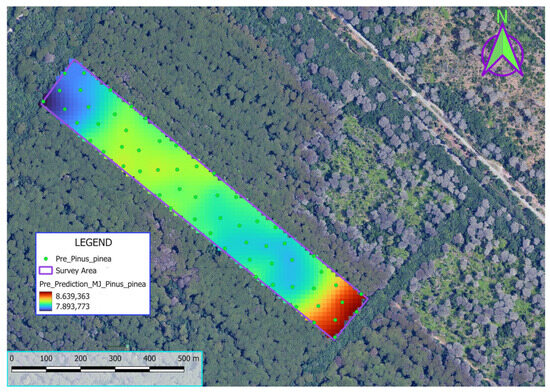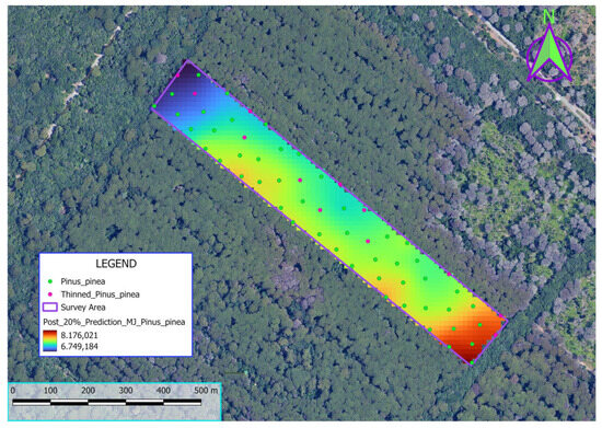 16] to interpolate spatially correlated data. This method was initially used to create a baseline visualization of calorific energy distribution in the study area before (see Figure 6) any silvicultural intervention.
