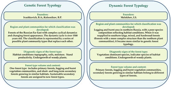 The success of forest management depends to a large extent on the ecological classification on which it is based []. Identifying a reliable scientific basis for sustainable forest management and biodiversity conservation is of great importance for European countries [] and North America [], as well as for the Russian Federation []. The possibility of obtaining extensive data on the structure of forests (including through the use of GIS technologies) has ushered in the era of big data, creating new opportunities for monitoring the state of forest ecosystems, which has exacerbated the problem of structuring the continuously arriving data. In this regard, improvements to the theoretical foundations of forest sciences and the development of new methods for forest inventory and classification, including the use of IT technologies to analyze large amounts of data, are becoming increasingly important []. Understanding the processes taking place in forests, the success of biodiversity conservation, and the organization of sustainable forest management largely depend on solving this problem. Therefore, the generalization of modern knowledge on this issue is extremely important in order to compare the results of different regional forest classifications and to develop new hierarchical forest typological schemes and other practical applications, as well as to develop the concept of a unified forest ecological classification at the country level. The purpose of this work is to review the current state of this area, priority lines of development, and unresolved problems in the original directions of ecological classification: genetic and dynamic forest typologies.