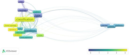 Keyword analysis allows the identification of the most important research areas and questions that researchers are looking for answers to. This research analysis showed that genetic and dynamic forest typologies have begun to have a lot in common. Figure 3 does not distinguish between the different forest typologies. For example, taking into account the dynamics of vegetation in forest typological units when classifying forests is the main scientific direction for both the genetic typology and the dynamic typology (Figure 3). The current priority research areas in genetic and dynamic forest typology are the improvement of the conceptual and methodological bases of forest dynamics accounting in classification units; the development of systems for the regional classification of disturbed territories for their restoration; and the improvement of the methodology for identifying forest types based on the remote sensing of territories and modern data analysis methods.