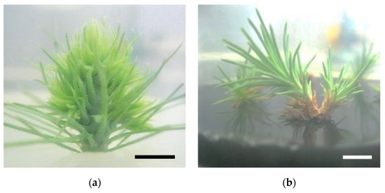 In vitro shoot cultures present a valuable alternative, because it is an easily accessible laboratory system, free from contaminations, where environmental and nutritional conditions are accurately measured and controlled. The use of in vitro culture systems, benefits from a significant reduction in genetic variation, because pine microshoots are clones of the mother plant, allows for the study of single variables within the host/nematode combination, and plant material can be obtained in large amounts without occupying much space [6,7]. These factors support the use of in vitro systems, as useful biotechnological tools, for phytopathological studies and monitorization of PWD progression.