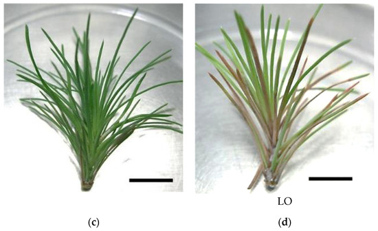 Pinus pinaster seedling shoot cultured in multiplication medium [culture medium supplemented with 0.5 µg/L of 6-benzylaminopurine (BAP) and 0.1 µg/L of indole-3-butyric acid (IBA)] (a), in vitro microshoots in elongation medium (culture medium supplemented with 3 g/L of activated charcoal) (b), and in vitro explants before (c) and after (d) pinewood nematode infection. Bar = 1 cm.