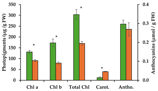 Quantification of chlorophyll a (Chl a) and b (Chl b), carotenoids (Carot.) (µg/g FW) and anthocyanins (Antho.) (µmol/g FW) through spectrophotometry, from extracts of in vitro pine shoots without (green bars) and with the pinewood nematode (orange bars). Asterisks over the error bars indicate significant differences between these conditions (p < 0.05).