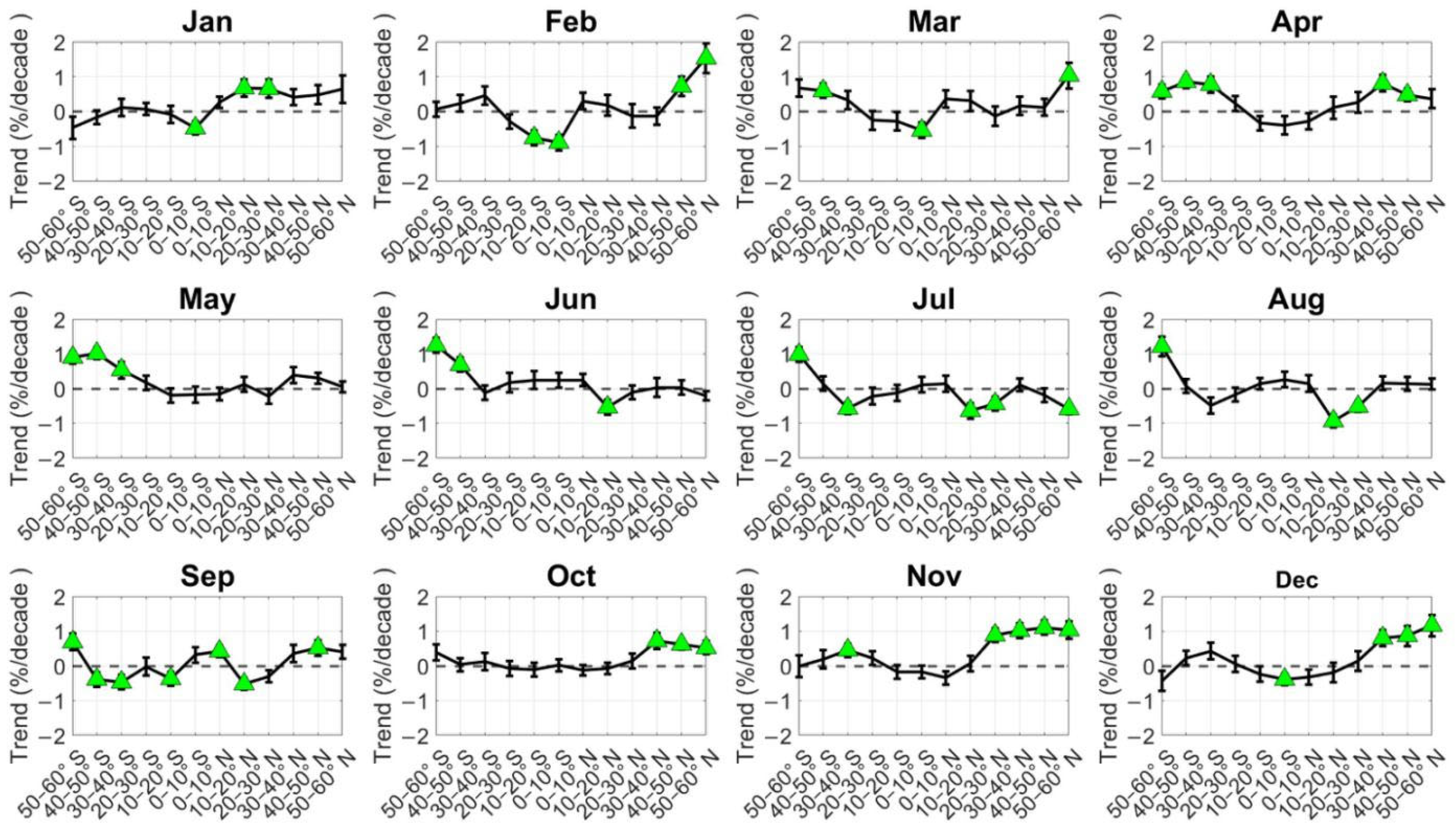 Moreover, a clear pattern of seasonal trends emerges. January exhibits positive trends in the northern hemisphere and negative or no trends in the southern hemisphere. In February and March, the northern hemisphere shows small positive or no trends in the tropics and subtropics, respectively, and high positive trends in the midlatitudes. Regarding the southern hemisphere, we observed high negative trends in the tropics, and a trend reversal as latitude increases. In April, trends are small and negative in the tropics, shifting to positive in the subtropics and intensifying further in the midlatitudes. In May, the southern hemisphere exhibits highly significant positive trends in midlatitudes. The trends decrease in the tropics and remain rather low in the northern hemisphere. June, July and August exhibit a quite similar trend pattern, with positive trends in 50–60° S and 40–50° S. The trend drops and reverses in the 30–40° S zone (in June the trend is close to zero) and increase again to close-to-zero values in the tropics. Trends drop strongly below zero again in the 10–20° N and then increase again to close-to-zero values in the northern midlatitudes (July trend in the 50–60° N drops to a negative value). September exhibits positive trends in the tropics and small negative trends as we move towards the subtropics of both hemispheres. Trends are positive in the northern hemisphere midlatitudes whereas in the southern hemisphere trends remain negative until 40–50° S and then become strongly positive in the 50–60° S. October, November and December exhibit a broadly similar pattern of trends. Trends in the northern midlatitudes are always strongly positive and significant. Trends decrease in the northern tropics, reverse slightly to negative values, increase in the southern low midlatitudes and fall back close to zero for November and below zero for December. In October, trends remain very close to zero as we move away from the northern midlatitudes to the southern midlatitudes. According to the figure, it appears that the strongest positive and significant trends are observed in the northern midlatitudes in November and December as well as February (just before and during the boreal winter) and in the southern midlatitudes in April, May and June (just before and during the austral winter). July and August also exhibit strong positive trends in the 50–60° S.