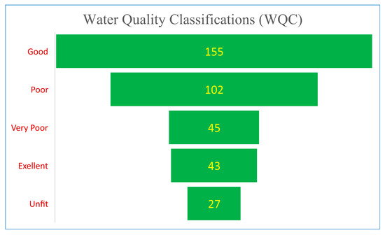 Water quality classification (WQC) is essential in predicting the precise results from the Water Quality Index. The WQI values were categorized into five water quality classes: a range of 0–25 represents excellent water quality, 26–50 indicates good water quality, 51–75 corresponds to poor water quality, 76–100 denotes very poor water quality, and values above 100 indicate water that is unfit for drinking purposes [