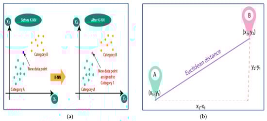 As shown in Equation (5), this formula determines the distance between a new data point and all training data points. The k closest data points are then identified, and the majority class among these neighbors is assigned to the new data point.