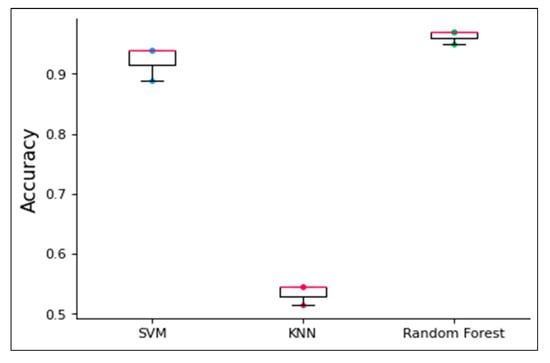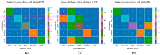 Figure 8a–c illustrates the 5 × 5 confusion matrices for the Support Vector Machine (SVM), K-Nearest Neighbor (KNN), and Random Forest (RF) classifiers, respectively. Each confusion matrix is color-coded to visually represent the distribution of correctly and incorrectly classified instances for the respective models. These matrices were utilized to compute the key performance metrics in