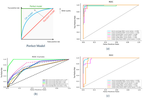 Figure 9a–c presents the Receiver Operating Characteristic (ROC) curves for the classifiers, displaying both individual class curves and micro and macro-average labels. The Area Under the Curve (AUC) quantifies the overall performance of the classifiers, with a higher AUC indicating better discrimination capability. In this study, the SVM algorithm exhibited superior ROC–AUC values compared to the other classifiers, highlighting its effectiveness in distinguishing between classes.
