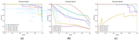 Figure 10a–c shows the precision-recall (PR) curves for all classifiers, which provide an additional perspective on classifier performance, especially in scenarios with imbalanced class distributions. The results demonstrate that the SVM algorithm outperformed the other models, maintaining higher precision and recall values. These curves provide critical insights into the models’ predictive performance, reinforcing the conclusion that the SVM algorithm is the most reliable classifier for this dataset.