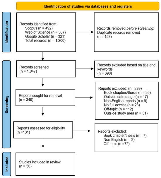At the full-text assessment stage, 299 articles were excluded for reasons such as classification as book chapters or theses (n = 26), publication outside the specified date range (n = 17), non-English language (n = 9), lack of full-text access (n = 23), thematic irrelevance (n = 112), or focus outside the Mediterranean (n = 31). Of the remaining 131 articles, a detailed eligibility review excluded a further 81 articles for similar reasons: book chapters or theses (n = 7), non-English language (n = 2), and off-topic studies (n = 72). Ultimately, 50 studies met all inclusion criteria and were selected for this review.