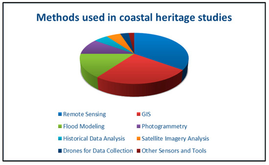 These methodologies, while distinct in their applications, are not mutually exclusive. The integration of software and hardware approaches offers a comprehensive approach to addressing the risks faced by coastal heritage sites. Software approaches enable large-scale analysis and predictive modeling, while hardware measures provide the on-the-ground insights needed for timely interventions. As illustrated in Figure 3, remote sensing analysis and GIS dominate as primary methodologies, while flood modeling, photogrammetry, and drones complement the technological toolkit. This balanced use of tools highlights the field’s commitment to leveraging innovation to safeguard cultural heritage under the growing threats of climate change.