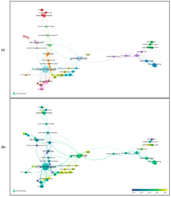 (a) Network Visualization of Keywords in Coastal Heritage Research. (b) Overlay Visualization of Keyword Trends Over Time.