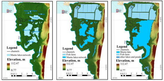 The most important morphological parameter of a lake is its water volume. In order to estimate the pilot-lakes volumes and their variation, a DEM was constructed using old topographic maps and actual descriptions of lakes taken from the literature [13,18] and discussions with the local population. In general, lakes are shallow, with an average depth of up to 1.5 m. In addition, aquatic vegetation is abundant, especially in Manta Lake, which increases the lake’s secondary pollution and siltation. Based on the modeled DEM, volumes were extracted using QGIS functions, and correlations with the lakes’ surface areas were performed (Figure 9).