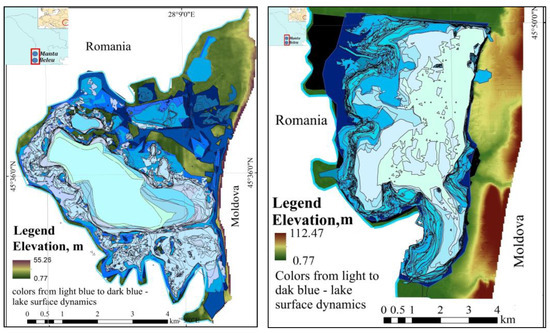 In the Republic of Moldova, lakes of natural origin are only a few dozen, many of which are very small and have not yet been mapped [6,7,8]. The most well-known and largest lakes are Old Dniester (oxbow of the Dniester River), situated in the lower part of the Dniester River Basin, and Manta and Beleu (floodplain lakes), situated in the lower part of the Prut River Basin. These are the only natural lakes delineated as water bodies in the national river basin management plans [7,8]. Representing important regions of natural ecosystems, lakes were included in the protected areas network [9] in order to increase the level of water and biodiversity protection and conservation. However, despite the large number of studies on the water quality, fauna, and flora composition of the lakes and surrounding areas [10,11,12,13,14,15,16,17] and the development of management plans [18,19], their main features such as lakes’ surface area and volume have not been analyzed to date.