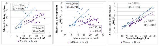In addition to the lakes’ surface area calculation, the other two parameters, shoreline length and shoreline development index [35], were determined. These parameters correlated with each other and with the lakes’ surface area (Figure 6). In the case of Beleu Lake, the shoreline length varies from 0 to 76 km, and in the condition of the most recent drought, this characteristic was about 9–11 km. Recent floods have increased the shoreline by about 30–50 km, while the floods of the late 70s and 80s—up to 70–76 km. The length of the shoreline corresponding to the average surface area is 14–20 km. The shoreline development index is, on average, 3, varying from 1.45 to 5.8, depending on the lake’s area. The relationships between the characteristics of Beleu Lake, including surface area, shoreline length, and shoreline development index, showed a high correlation, with the coefficient of determination reaching a value of 0.42–0.9.