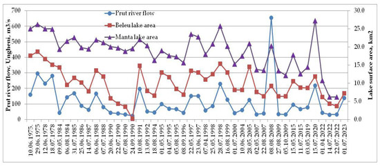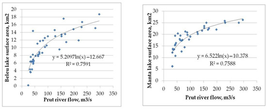 Based on the constructed correlations and comparison of the Prut River flows and lakes surface area (Figure 7 and Figure 8), the following was established: during low Prut River flow, ≤30 m3/s, lakes areas decrease to 6–8 km2 in the case of Manta and 0–5 km2 in the case of Beleu. Flows of 30–50 m3/s increase the lakes’ surface area to 8–15 km2 (Manta) and 5–8 km2 (Beleu). Flows of 50–70 m3/s cause an expansion of lakes to 15–18 km2 (Manta) and 8–11 km2 (Beleu). The extent of Manta and Beleu lakes of 18–21 km2 and 11–13 km2 is caused by flows of 70–100 m3/s. An increase in surface area to 21–23 km2 for Manta and 13–14 km2 for Beleu occurs with discharges of 100–200 m3/s. When the Prut River exceeds 200 m3/s, the lakes expand beyond 23 km2 for Manta and 14 km2 for Beleu.