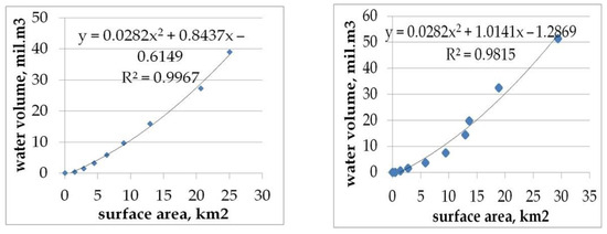 Correlation between the surface area and volume of Beleu Lake (left) and the surface area and volume of Manta Lake (right).
