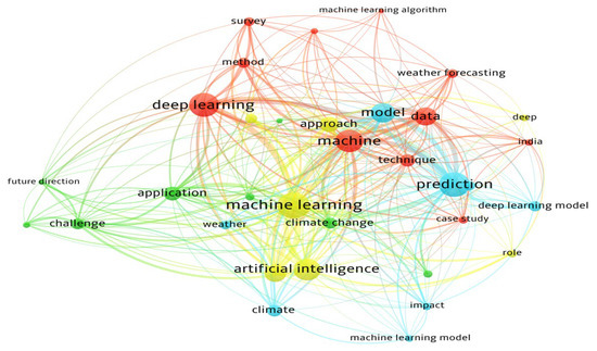 Co-occurrence network, showing four clusters: (i) deep learning, (ii) forecasting and prediction, (iii) AI in climate applications, and (iv) challenges and future directions, highlighting the shift toward AI-driven hybrid modeling.