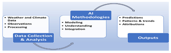 Forecasting capabilities have been significantly transformed by the introduction of AI and deep learning. Neural networks and ensemble techniques now enable real-time data processing and pattern recognition, enhancing prediction accuracy for key variables such as temperature, precipitation, and atmospheric circulation [27]. Deep learning models, including convolutional neural networks and long short-term memory networks, have consistently outperformed traditional approaches in forecasting major climate phenomena such as the El Niño–Southern Oscillation, cyclone intensity, and precipitation nowcasting [29,30]. AI-enhanced forecasting systems also streamline data analysis and automate bias correction, creating more efficient workflows that support disaster preparedness and climate risk assessment. However, the quality and size of available training datasets remain limiting factors, particularly when predicting rare or unprecedented events [11,20].