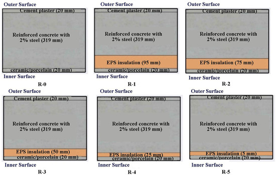 | R-0 (Base Case) | Cement plaster, Reinforced concrete, Ceramic tile | 0 | 359 | 3.218 |