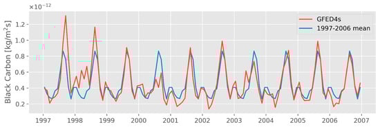 Global, area-weighted BC emission flux for the base (GFED4s) and mean (GFED4s 1997–2006 mean) scenarios. Monthly values are shown.