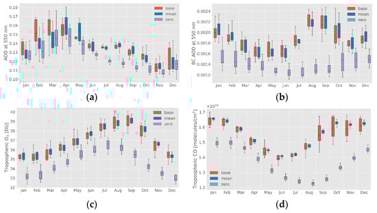 Figure 2 presents boxplots illustrating the extent of the effects of the base, mean, and zero BB emissions scenarios on the seasonal variation of these quantities. As sea spray and mineral dust can primarily contribute to the overall AOD [11], BC AOD is examined independently. Eliminating BB emissions reduces AOD values and the abundances of O3 and CO. Additionally, the peaks in AOD and BC AOD from July to October are absent, and a shift in the seasonality of O3 and CO occurs. The mean scenario reproduces the July to October AOD peak; however, it indicates an AOD maximum that occurs later within the year. This is attributed to a lack of variability in BB emissions from sub-Saharan wildfires in the mean scenario.