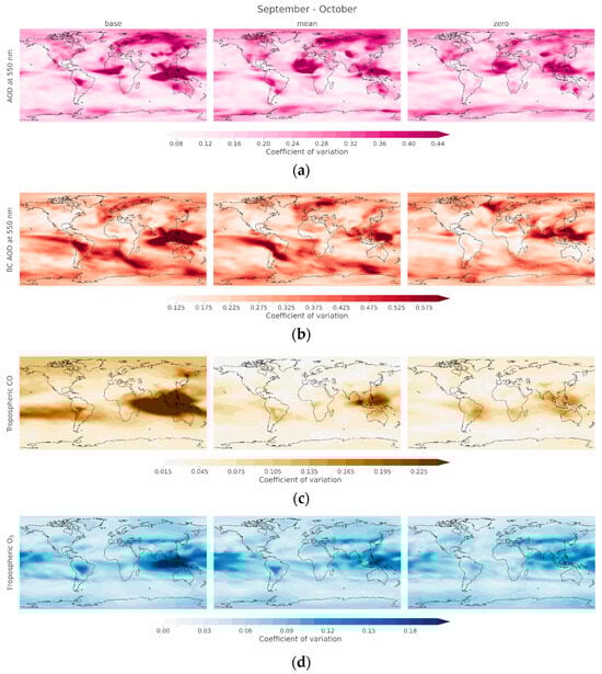 September–October coefficient of variation maps for the base, mean, and zero BB emissions scenarios: (a) Total AOD at 550 nm; (b) BC AOD at 550 nm. Tropospheric columns: (c) CO; (d) O3. Note that higher coefficient of variation values may arise from lower mean values, as in the case of tropospheric CO in northern latitudes, for the zero scenario.
