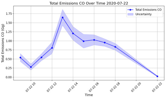Hourly total carbon monoxide (CO) emissions for 22 July 2020, the first day of the Korinthos wildfire, were derived from SEVIRI FRP data (Figure 1). These emissions were calculated using biome-specific emission coefficients applied to hourly FRE values. The resulting estimates are expressed in gigagrams (Gg) and include uncertainty bands that reflect variations in both the FRP data and the emission factors used.