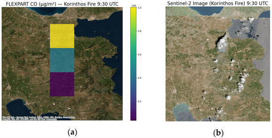 (a) FLEXPART-simulated CO column at 09:30 UTC on 22 July 2020 and (b) Sentinel-2 imagery showing visible smoke plume from the Korinthos wildfire.