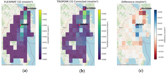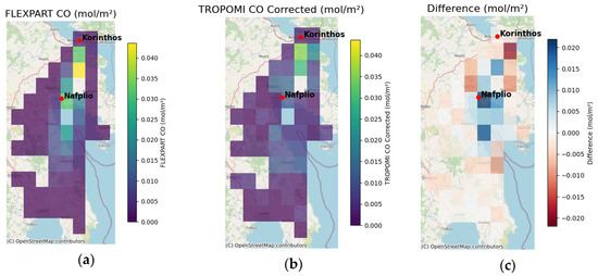 Figure 3 shows a three-panel comparison of (a) FLEXPART, (b) TROPOMI, and (c) their spatial difference. The general pattern of CO concentrations is reproduced, especially over the Korinthos–Nafplio axis. However, some mismatches are evident particularly near the fire origin and southern extent of the plume.
