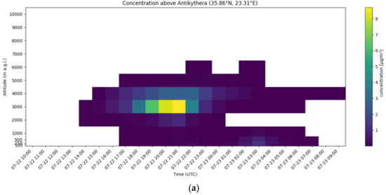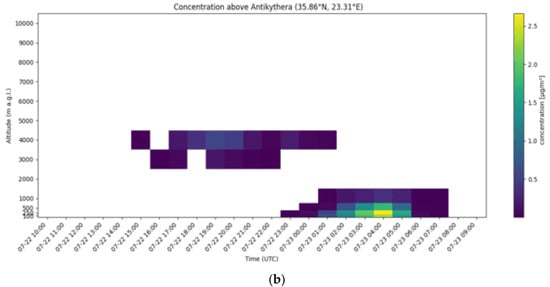 Figure 5a shows the TPM concentrations from the WARM START simulation. A distinct aerosol layer appears between 2000 and 3000 m, starting around 14:00 UTC on 22 July, peaking near 21:00 UTC, and persisting until the early hours of 23 July. The vertical structure and intensity indicate a continuous and realistic depiction of lofted smoke as it traveled toward Antikythera.
