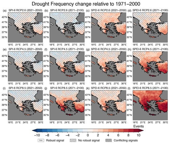 Changes in agricultural drought frequency (DF) for the near future (2021–2050) and the end of the century (2071–2100) relative to the reference period (1971–2000) under the three different RCP scenarios are presented in Figure 1. The central and southern parts of Greece show the largest changes in DF in all cases and especially under RCP8.5. In the case of SPEI-6, DF is projected to increase mainly over regions south of Thessaly in both future periods under RCP4.5 and RCP8.5, which is a robust feature among all climate models. One the other hand, SPI-6 shows a robust increase in DF over the same regions only by the end of the century under RCP4.5 and particularly RCP8.5. Results obtained using SPEI-6 are generally more robust, with the detected drought events increasing by more than 10 (up to 7) over Thessaly, the Peloponnese, Crete and the southern Aegean under RCP8.5 (RCP4.5). It is important to note that the SPEI incorporates both precipitation and potential evapotranspiration, making it more sensitive to the statistically robust temperature changes projected over Greece under all three RCP scenarios [7]. Through use of the SPI, robust changes are obtained under RCP4.5 and particularly RCP8.5, mostly for the end-of-century period.