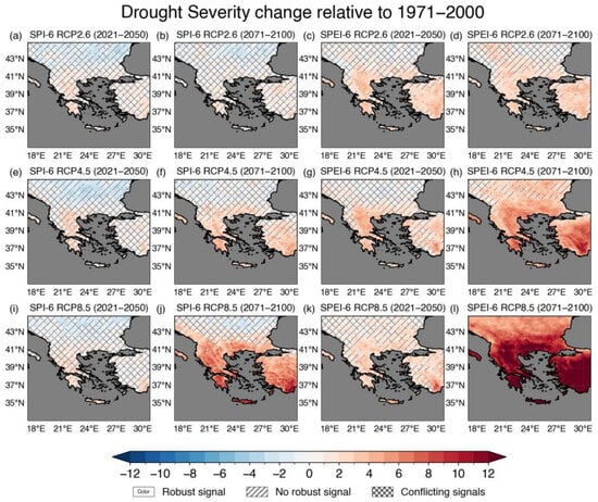Changes in drought severity (DS) are depicted in Figure 3. Drought duration and severity changes tend to show similar results, as they are intrinsically correlated [4]. Consequently, DS is projected to increase the most by the end of the century under RCP8.5, and more so for the droughts detected with SPEI-6. Robust increases in DS are projected across Thessaly, the Peloponnese, Central and South Aegean and Crete in the end-of-century period under RCP4.5 and RCP8.5 for SPI-6 and during both future periods under all three RCPs for SPEI-6.