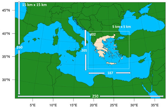 The domain configuration (Figure 1) is consisted of two telescoping nests (one-way), which cover an extended region of Middle and East Mediterranean (d01) and a wider area of Greece (d02). The horizontal discretization has been changed to 15 × 15 km (from 10 × 10 km) and 5 × 5 km (from 2 × 2 km) for the parent and the inner domain, respectively.