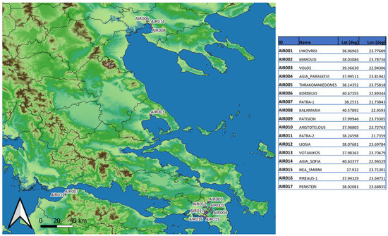 The evaluation of the WRF-AtmoHub modelling system and its downscaled air quality forecasts was conducted using surface observations of O3, NO2, SO2, PM2.5, and PM10 concentrations (μg/m3) from the AirBase European air quality database, maintained by the European Environment Agency (EEA). Seventeen AirBase monitoring stations across Greece (Figure 2) were included in the analysis, covering the period from 5 September 2024 to 14 January 2025.