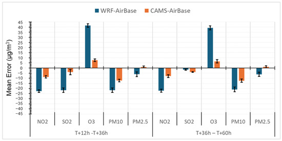 Mean Error (μg/m3) of NO2, SO2, O3, PM10 and PM2.5 at 17 AirBase stations. Blue bars represent WRF-AtmoHub forecasts for Day 1 (T + 12 h − T + 36 h) and Day 2 (T + 36 h − T + 60 h), while orange bars show CAMS regional ensemble forecasts, both compared against in Airbase situ observations.