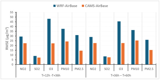 Figure 3 and Figure 4 illustrate the ME and RMSE values, respectively, contrasting the WRF-AtmoHub and CAMS regional forecasts against AirBase observations for both forecast windows.