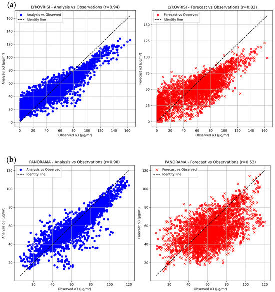 Figure 5 illustrates representative scatter plot analyses for ozone at: (a) Lykovrisi station in Athens, and (b) Panorama station in Thessaloniki. The plots compare CAMS regional analysis data (blue) and forecast outputs (red) against in situ AIRBASE observations. The calculated R2 values provide insight into the model’s predictive skill and consistency.