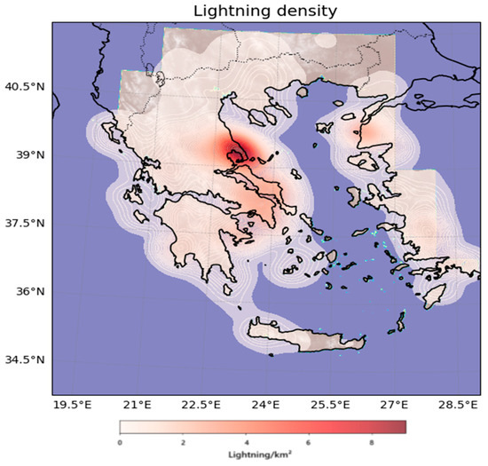 Spatial distribution of lightning density (in lightning/km2) during the period 4–7 September 2023.
