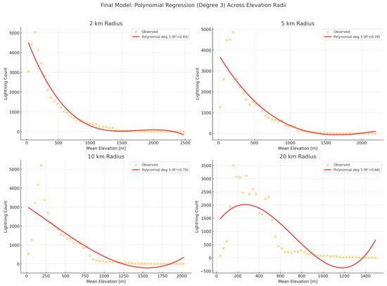 The statistical modeling further revealed that the interaction between elevation and lightning occurrence is inherently non-linear and influenced by spatial scale. The application of third-degree polynomial regression provided a significantly better fit than linear models, capturing subtle variations in lightning frequency across the elevation spectrum. As the analysis radius increased, the relationship between terrain and storm activity became progressively smoother and less pronounced, highlighting the diminishing sensitivity of convection to local terrain details at broader scales. This supports the view that orographic effects are most impactful when examined at fine spatial resolutions, and that a flexible modeling approach is necessary to fully characterize the terrain’s modulation of convective behavior.