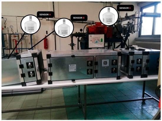 Baghouse retention units are devices in which a stream of exhaust gas and dust flows enter the chamber and are contained on their surfaces. The PM2.5 particles are trapped on the surface of the filters, creating a dust cake, while the outlet provides clean air to the room. According to the standard, maintenance and cleaning of the filters are necessary to ensure a stable performance and a longer life. Bag filters have high efficiencies, even for small particle diameters (~99%), as their filters have a filtration range from 100 μm to 0.3 μm [5,6]. These filters have a multitude of applications in the food, chemical, and mineral industries; in the power generation sector; and in workplaces where particulate emissions from various non-industrial activities are observed. The deployment of low-cost air quality sensors within the filtration unit at three distinct locations (the inlet, intermediate section, and outlet) has been demonstrated to facilitate the acquisition of valuable data for the purpose of evaluating the performance under varying conditions and emission sources.