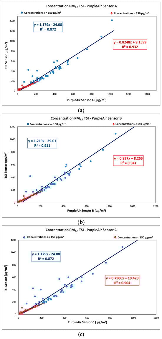 The calibration procedure under scrutiny demonstrates and confirms [9] a high correlation between the low-cost Purple Air sensors (A, B, C) and the TSI DustTrak 8530 sensor (TSI Incorporated, Shoreview, MN, USA) reference instrument with regard to both concentrations exceeding 150 µg/m3 and concentrations falling below this threshold.