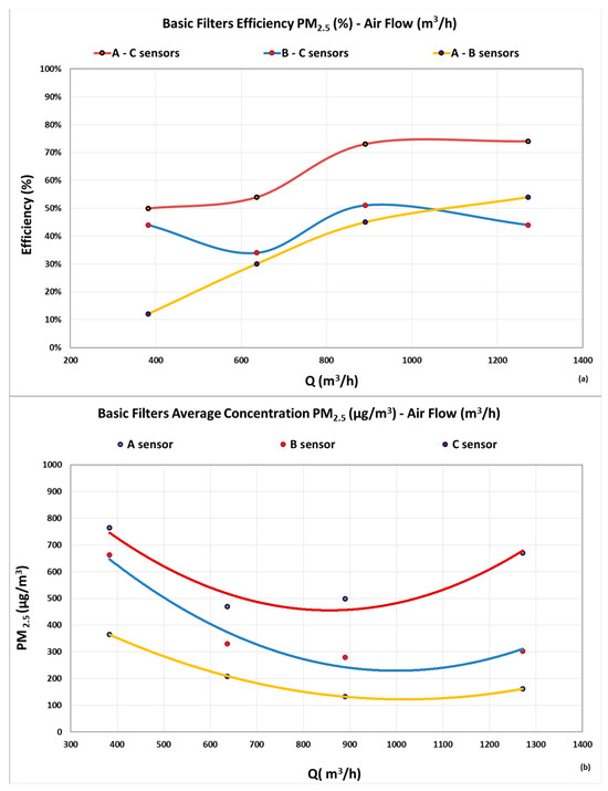 Scenario (A) showed that the performance of the filter unit using only the fixed filters (G2 and FCC) is higher at high air flows [11] and between the inlet and outlet sensors (A–C), with an efficiency of over 73%, while the corresponding average concentrations show lower values at the outlet (sensor C), confirming that the use of even only the fixed filters reduces emissions.